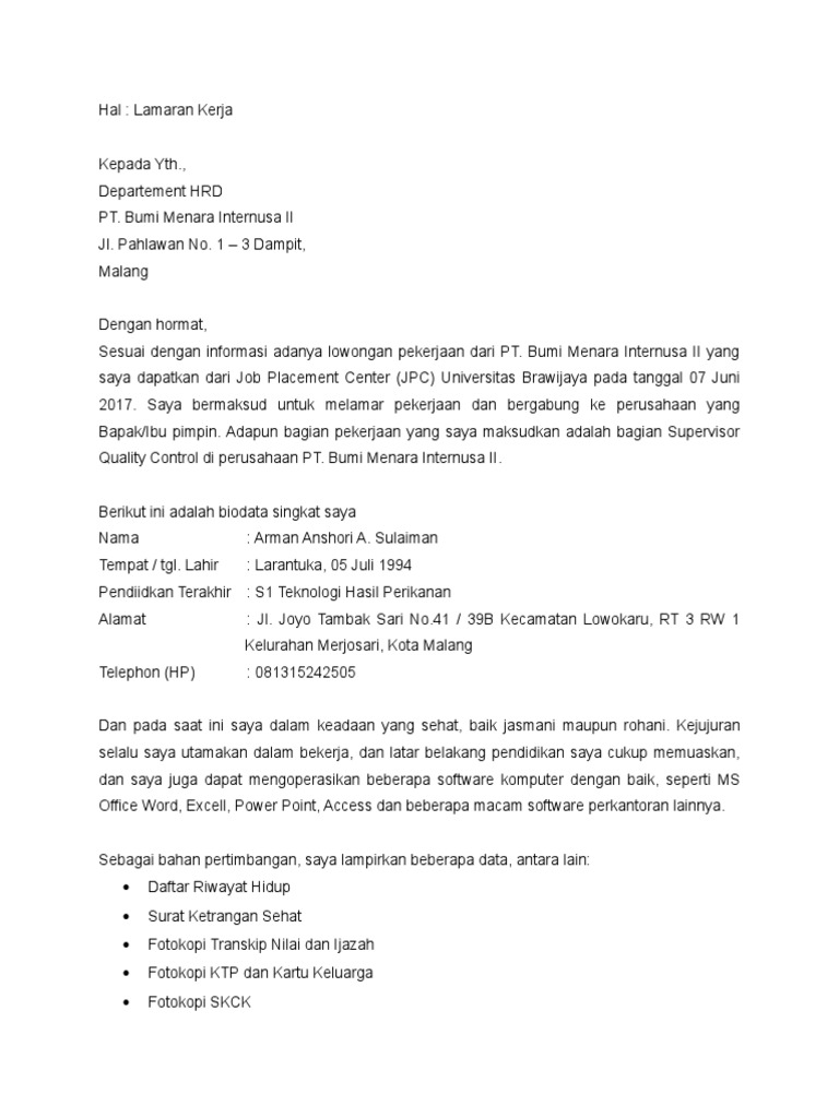 Dokumen kerja pertama kali diliat adalah surat lamaranmu, jangan sampai hrd kecewa, berikut contoh surat lamaran kerja yang baik dan benar. Berikut ini adalah contoh surat lamaran kerja via email di pt sebagai karyawan yang bisa dicontoh dan dijadikan acuan saat melamar kerja. Berikut ini contoh surat lamaran kerja yang baik dan benar serta menarik perhatian yang dapat anda gunakan dalam tema maupun format penulisan surat. Contoh surat lamaran kerja pt. Anda tentunya harus mencari perusahaan yang mau menerima calon karyawan yang belum memiliki pengalaman. Dulu, surat lamaran kerja memang selalu dikirimkan lewat pos atau diantar langsung ke perusahaan/kantor. Kalimatnya mudah dipahami dan sesuai dengan format penulisan surat lamaran kerja yang kita buat pada pt atau perusahaan biasanya digunakan untuk melamar pekerjaan pada bagian marketing atau pemasaran. Karena kami akan menyajikan banyak contoh surat lamaran pekerjaan sebagai karyawan atau pegawai di sebuah perusahaan, pt, ataupun di. Surat lamaran kerja ialah suatu surat permohonan yang dibuat oleh pencari kerja (pelamar pekerjaan), untuk dikirimkan kepada suatu badan usaha atau instansi agar mendapatkan pekerjaan contoh surat lamaran kerja. Saya doakan agar mendapatkan posisi yang tepat sesuai kemampuanmu. Jika anda membutuhkan format surat lamaran kerja dalam bahasa inggris, ataupun versi tulisan tangan silakan cek artikel yang terkait. Dalam jangka waktu tertentu sebuah pt selalu rekruitmen tenaga kerja baru sehingga peluang pekerjaan selalu. Dalam membuat surat lamaran kerja ada sistematika dan elemen yang perlu ada, yaitu direktur pt.