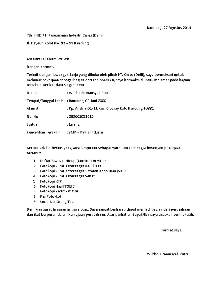Dalam jangka waktu tertentu sebuah pt selalu rekruitmen tenaga kerja baru sehingga peluang pekerjaan selalu. Contoh surat lamaran kerja pt. Berikut ini adalah contoh surat lamaran kerja via email di pt sebagai karyawan yang bisa dicontoh dan dijadikan acuan saat melamar kerja. Contoh surat lamaran kerja di pt juga biasanya membutuhkan pendidikan terakhir yang kita tempuh. Penerima dan alamat surat dibawah tanggal surat. Contoh surat lamran kerja simple. Dalam pembuatan surat lamaran kerja di pt anda harus menulis posisi yang sesuai dengan yang dibutuhkan pt tersebut. Anda sedang membuka postingan contoh surat lamaran kerja pt ahm yang berada pada kategori contoh surat dengan tag postingan berikut. Mulailah dengan membuat surat lamaran kerja yang baik dan benar. Dengan hormat, berdasarkan informasi lowongan pekerjaan di website resmi pt. Cara membuat surat lamaran kerja harus ditulis padat, jelas, dan rinci serta tidak berlebihan. Baru saja menyelesaikan program pasca sarjana? Anda tentunya harus mencari perusahaan yang mau menerima calon karyawan yang belum memiliki pengalaman.